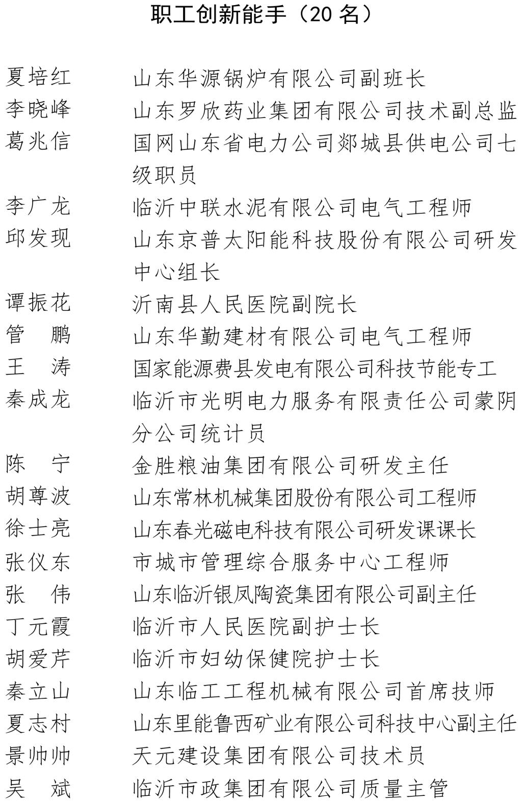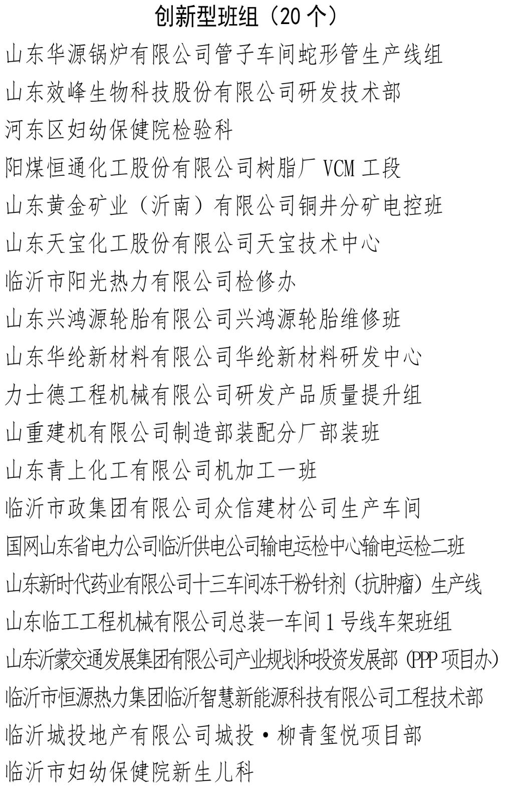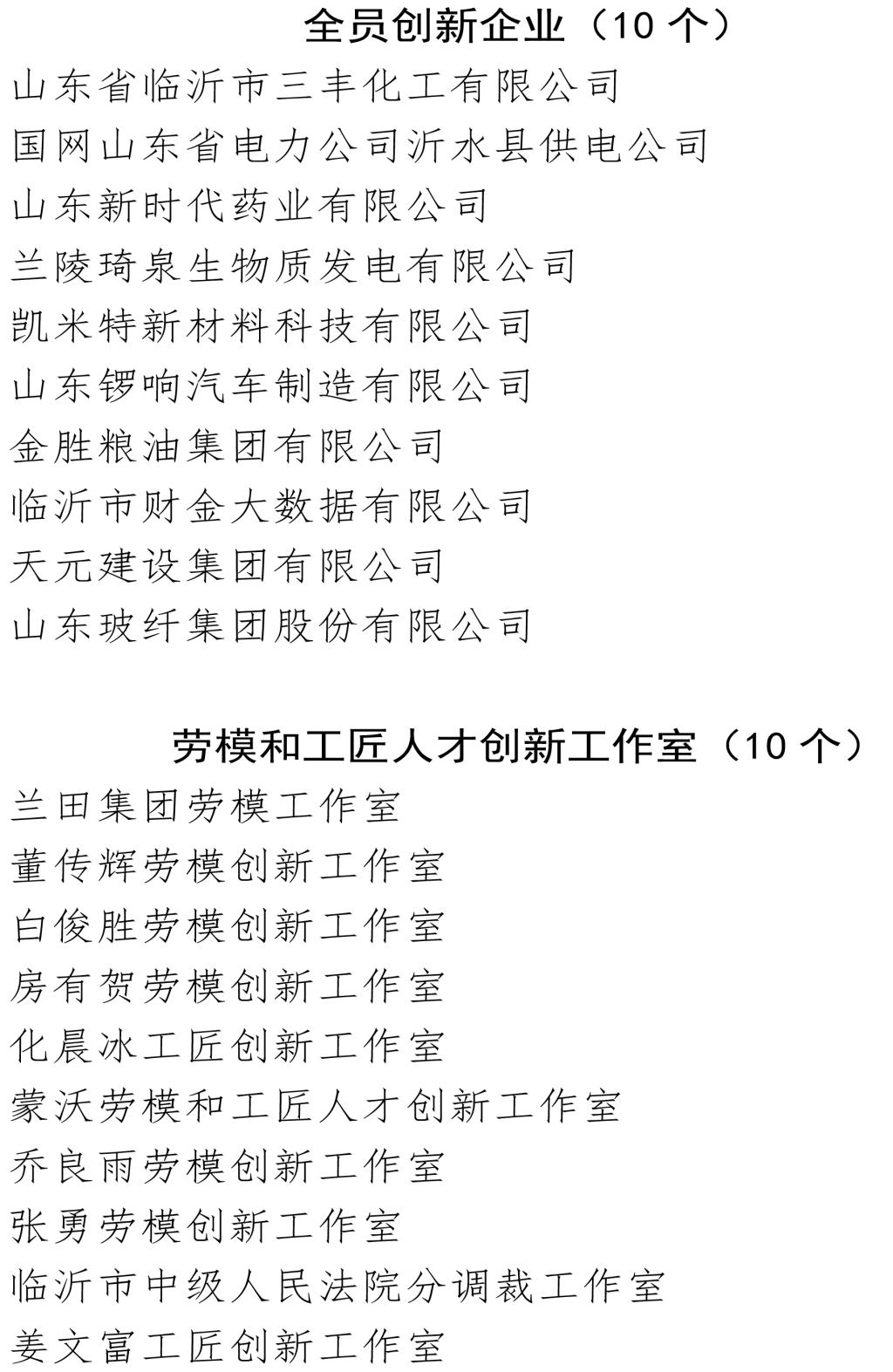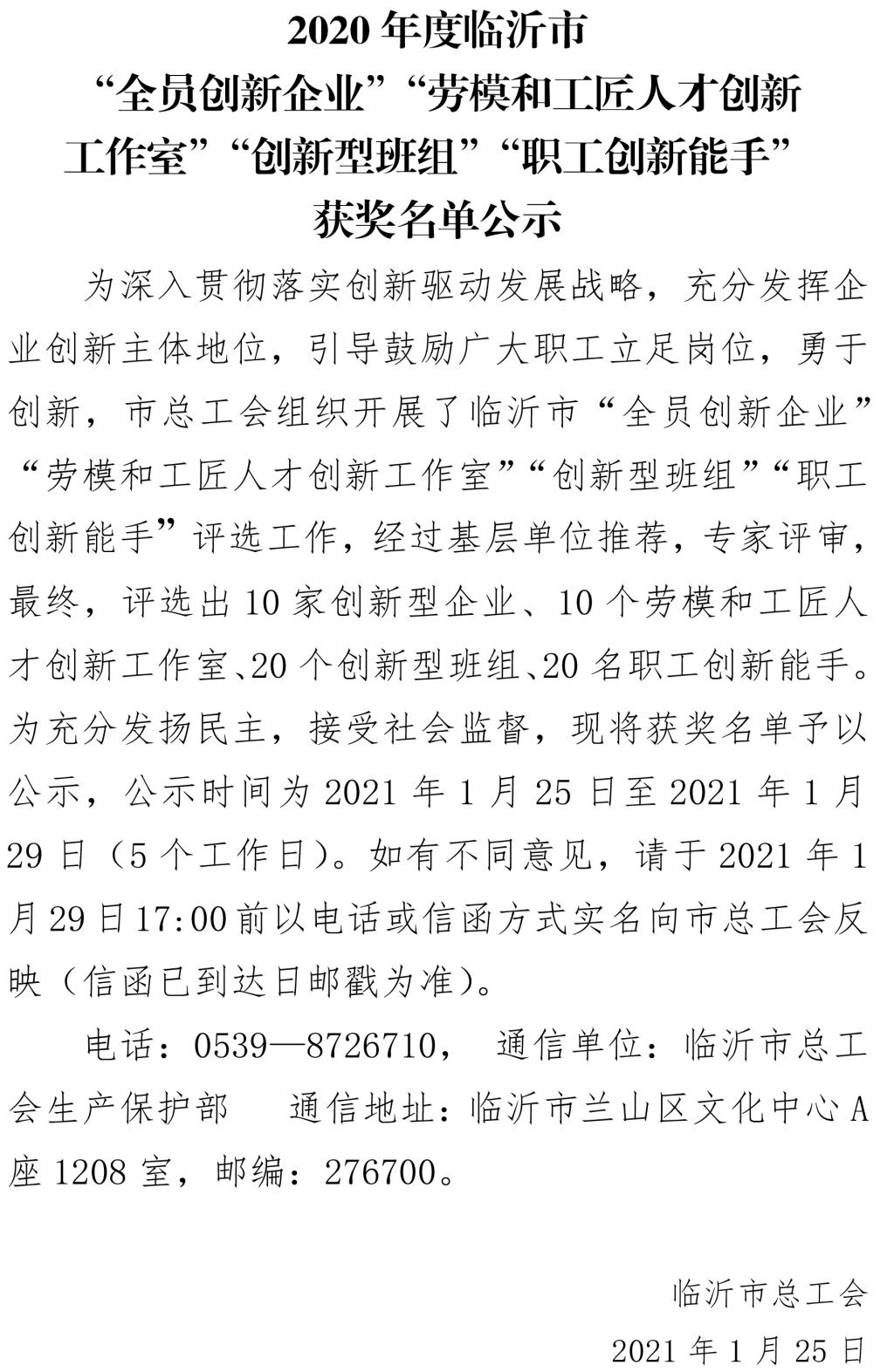 2020年度临沂市 “全员创新企业”“劳模和工匠人才创新 工作室”“创新型班组”“职工创新能手” 获奖名单公示-澳门正规网站