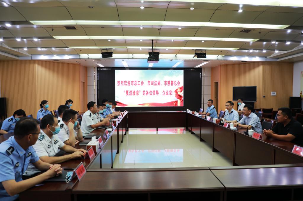 慰问团一行为司法干警们送去绿豆、白糖、沂蒙炒鸡、高水平消毒液、香菇酱等价值12万余元的防暑防疫和生活物资,并围绕疫情防控、文明创建、基层基础设施改善和一线职工实际需求等方面召开座谈会。