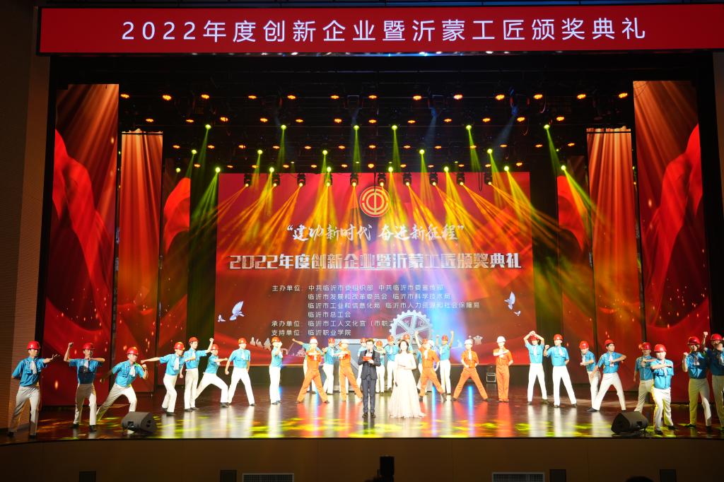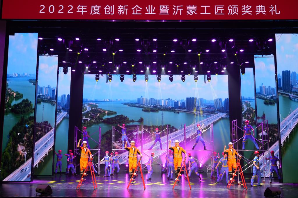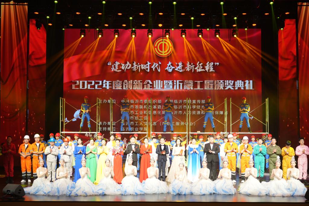 颁奖典礼上,与会领导为获得2022年度省市全员创新企业、劳模和工匠人才创新工作室、创新班组、创新能手,以及第四届沂蒙工匠、第五届齐鲁工匠、鲁班首席工匠称号的单位和个人颁奖。《奋斗者》《沂蒙工匠》《奋斗的时代在一起》《大国工匠》等歌舞表演,展现了新时代产业工人昂扬向上、奋发有为的精神风貌,曲艺说唱《你是这样的人》、情景剧《光荣与梦想》用生动的角色和深情的语言,立体展现了劳模精神、劳动精神、工匠精神的深刻内涵,引起全场共鸣,热烈的掌声此起彼伏。