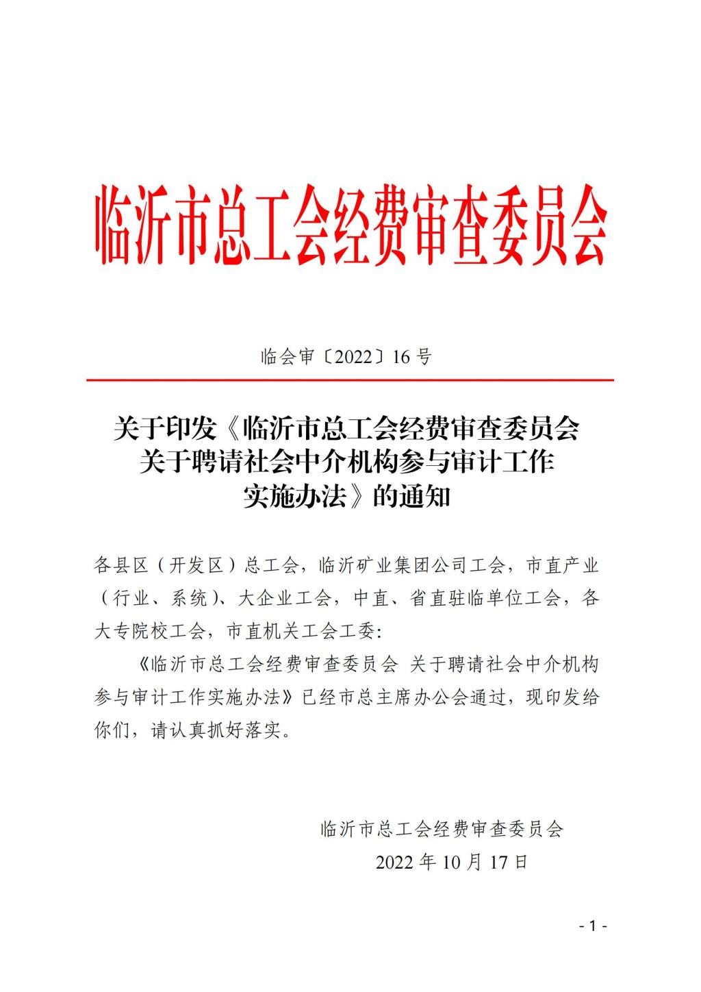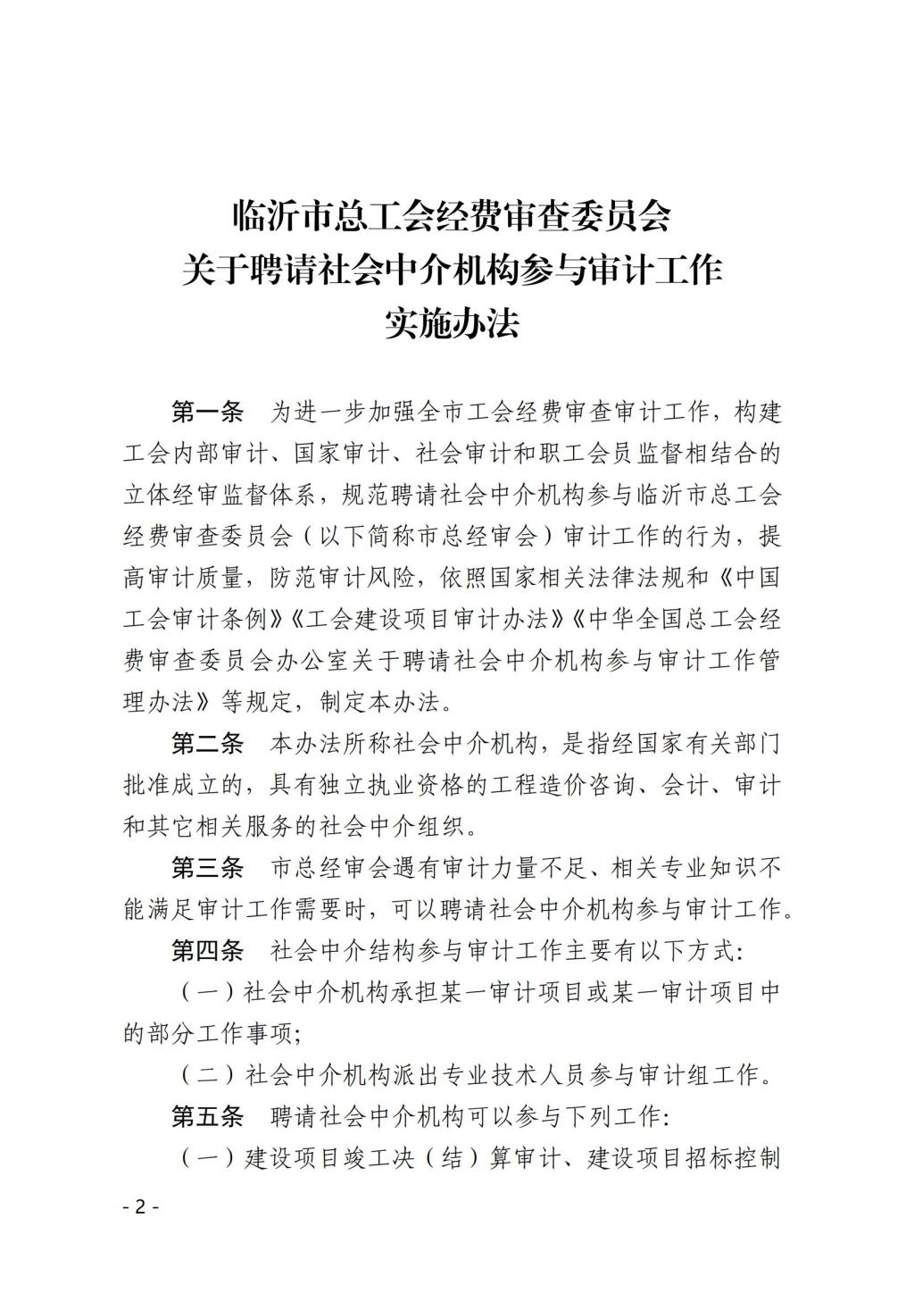 关于印发《临沂市总工会经费审查委员会关于聘请社会中介机构参与审计工作实施办法》的通知-澳门正规网站