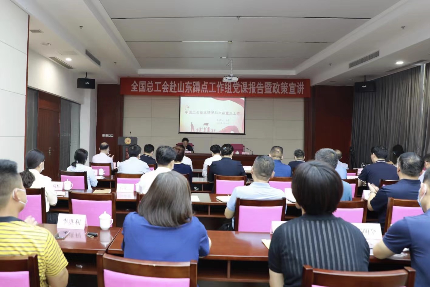 7月22日,全国总工会赴山东临沂蹲点工作组举办专题党课暨政策宣讲报告会,集体传达学习全总党组书记、副主席、书记处第一书记陈刚7月14日为全总机关党员干部讲专题党课精神;全总第五临时党支部书记、全总赴山东临沂蹲点工作组组长、全总基层工作部二级巡视员马华讲专题党课并进行有关政策解读。市总工会党组书记、常务副主席王剑峰主持报告会并讲话,市总领导李建成、孙兰珂、于建坤、张涛、王秀丽、张雪峰参加。