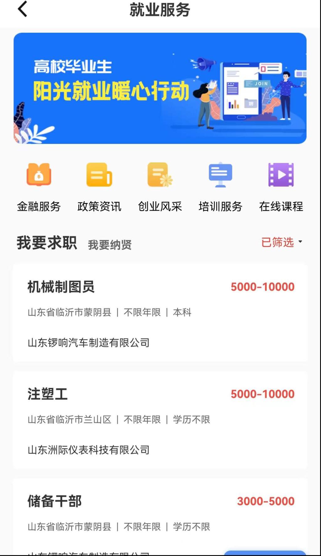 齐鲁工惠app内提供就业政策咨询、创业风采展示、就业培训服务、在线课程观看等服务内容。求职者可以根据需求筛选招聘企业、工作地点、薪资待遇等招聘条件。