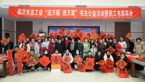 为进一步丰富职工文化服务内容,弘扬优秀传统文化,营造欢乐吉祥﹑温暖和顺的节日氛围,1月23日,临沂市总工会“送万福 进万家”书法公益活动暨职工书画笔会在市工人文化宫成功举办。活动邀请我市书画名家及职工书画家们为广大职工书春送福,来自快递、建筑行业等近100名职工到场领福。